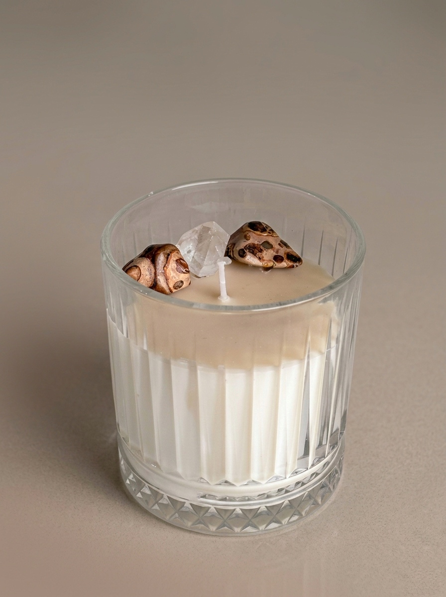 Lumânare din ceară naturală de soia, turnată manual în recipient din sticlă, decorată cu cristale naturale de Cristal Jasp Leopard & Cristal de Stâncă (Cuarţ transparent )